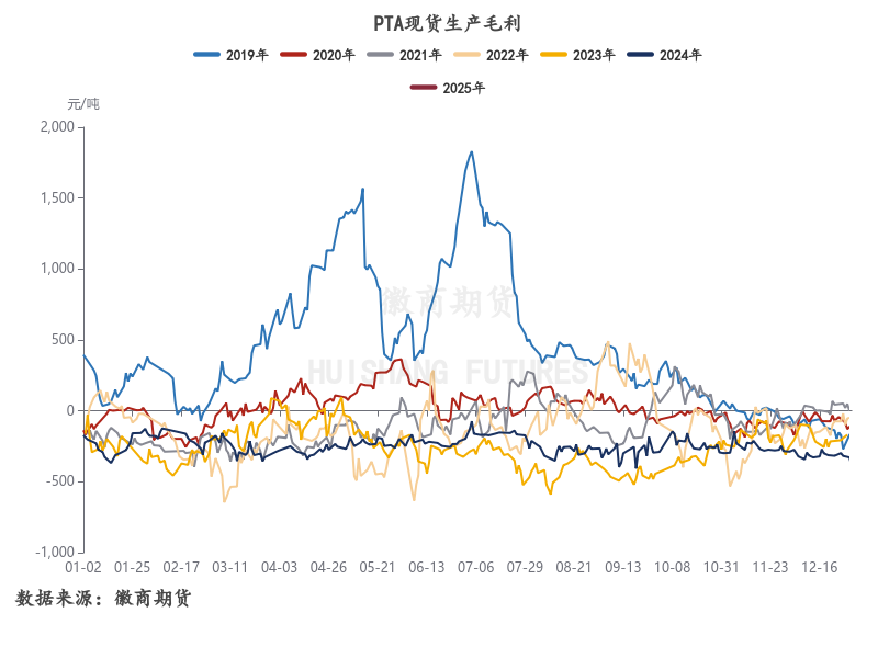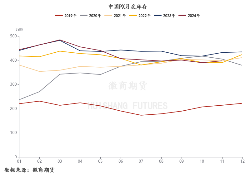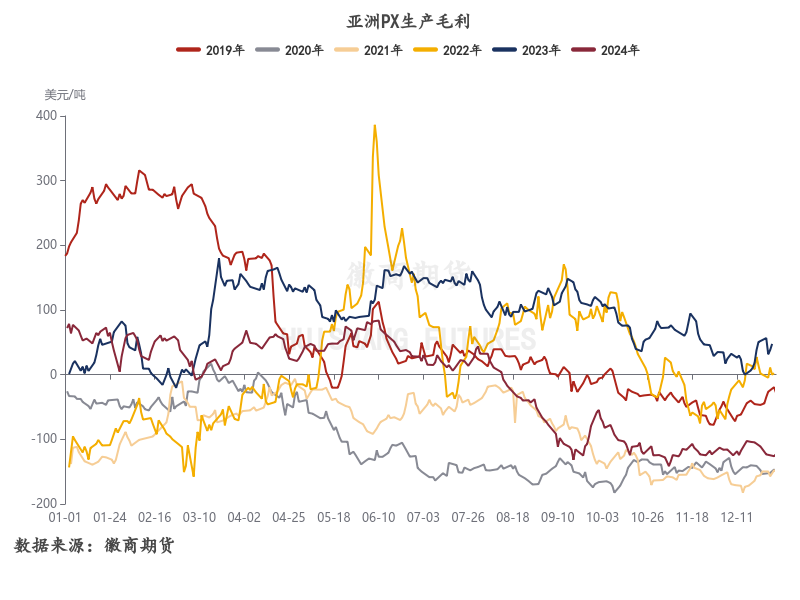 2024年PX生产毛利大体上处于60至-200美元/吨之内,即便一季度出现大幅累库,仍能给到PX一定利润,但在下半年PX供需压力不大的情况下,跟随美国汽油利润出现了大幅度压缩,这也导致了下半年聚酯链各产品价格的崩塌,可以说与自身基本面关系较差。目前PX利润来到-120美元/吨左右的极低值,估值偏低,再次下行的可能性不大,而美汽油消费旺季一般在4-8月份,虽然预期需求高点不会太高,但预计仍对PX价格有一定支撑。