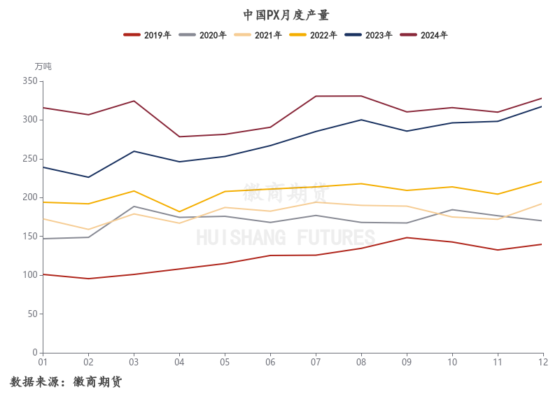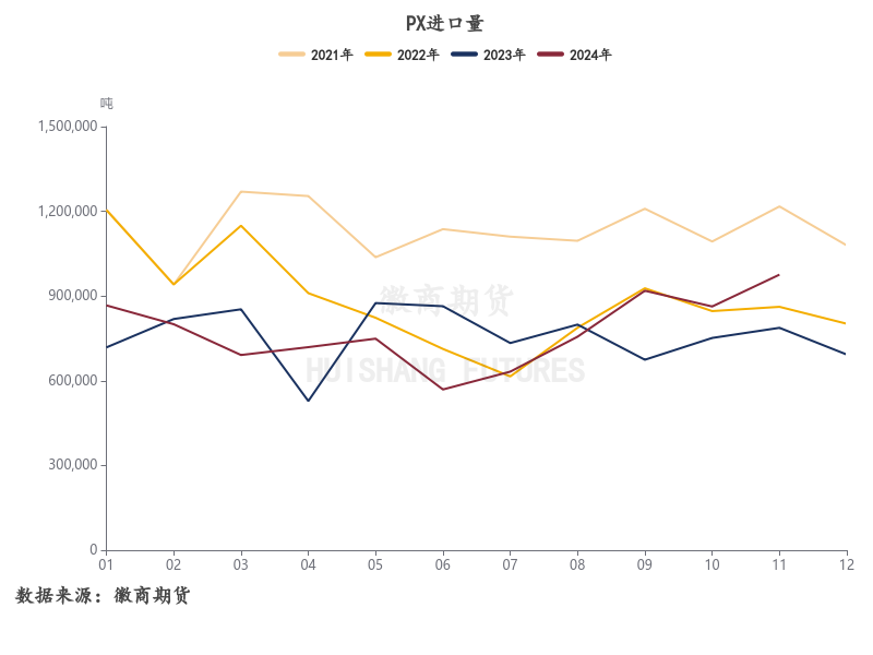 2024年我国PX平均开工率为84.83%,较2023年的77.39%大幅提高,在PTA产能基数较大的背景下,PX装置开工的积极性较高,尤其体现在新装置上,导致国内PX产量增长明显,全年产量约3724万吨,较2023年增长474万吨,增幅14.58%。但目前PX在84.83%高开工率的基础上,整体开工率进一步提升能力有限,供应压力并不大,在PTA仍有投产的情况下,PX货源或保持紧平衡的状态。