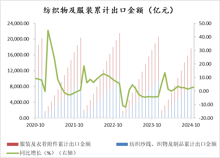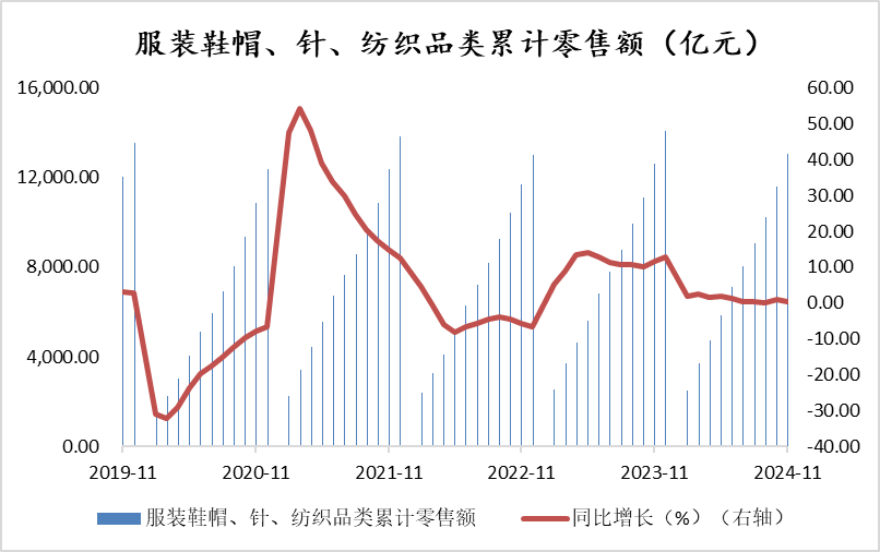 国内服装纺织需求恢复程度有限,截止至2024年11月,服装鞋帽、针织、纺织品类零售额累计值为13073亿元,同比增长0.40%。外需方面,截止至2024年11月,纺织纱线、织物及制品、服装及衣着附件出口累计值为19413亿元,同比增长2.93%。整体看,终端消费表现一般。