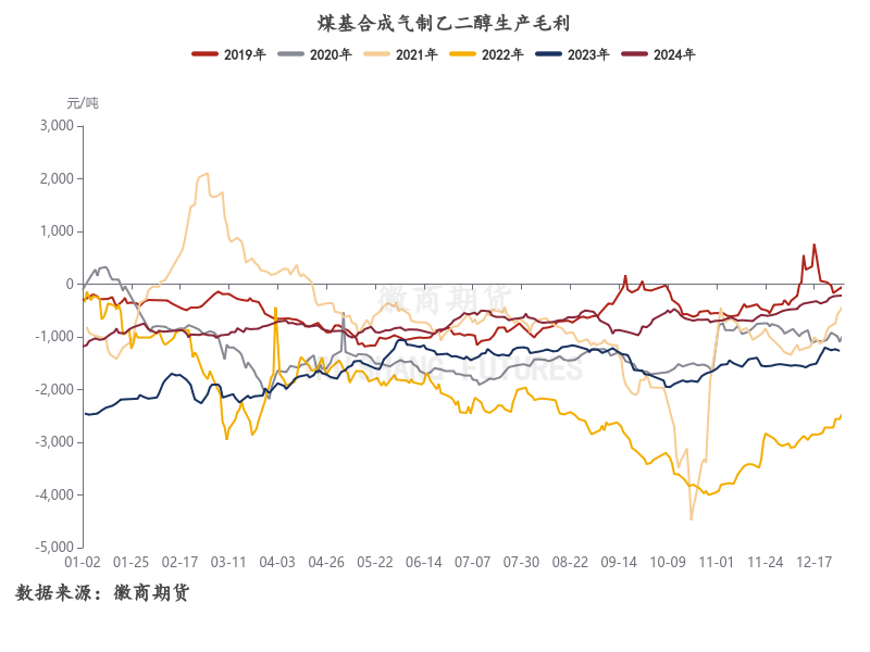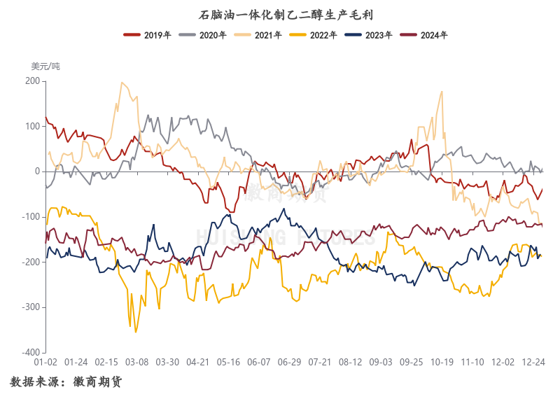 2024年乙二醇走势与原油和聚酯链分化较为明显,整体在4200元至4800元内运行,价格低点不断抬高,高点有突破迹象,走势明显偏强,在下游需求不断增加,自身库存创下三年低位的背景下,自身利润不断修复。由于今年煤炭价格走弱,煤基合成气制乙二醇利润大幅修复,目前亏损约200元/吨,一体化制乙二醇亏损约120美元/吨。2025年随着乙二醇供需继续好转,乙二醇利润有望再度被修复,2024年乙二醇利润修复的空间支撑乙二醇走出了独立行情,乙二醇在2025年更值得期待。