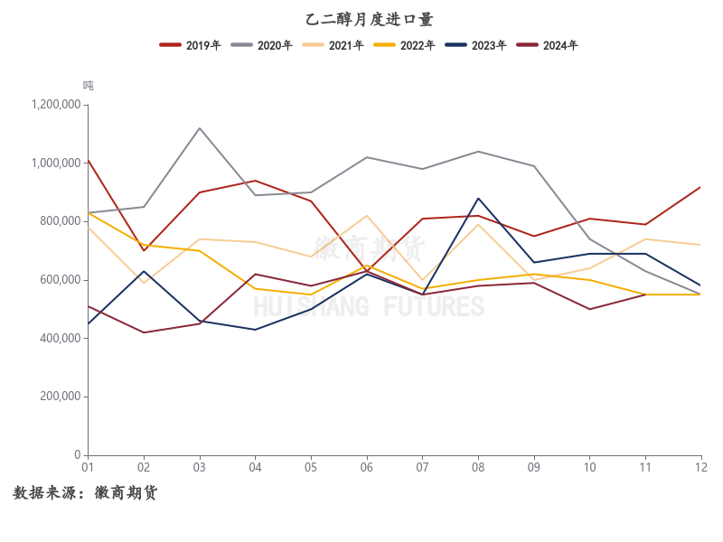 2024年的我国乙二醇平均开工率为60.44%,较2023年的56.36%大幅提升,全年乙二醇产量1873万吨,较23年的1644万吨增长13.93%,主要是在2024年下游聚酯陆续投产后,乙二醇价格表现明显偏强,利润缓慢修复导致,预计明年乙二醇平均开工维持在60%-65%,产能过剩的格局将进一步得到修复。进口方面,2024年乙二醇全年进口约650万吨,较2023年的725万吨下降10.34%,主要是中东装置仍存在效益问题导致,2025年进口压力预计不大。
