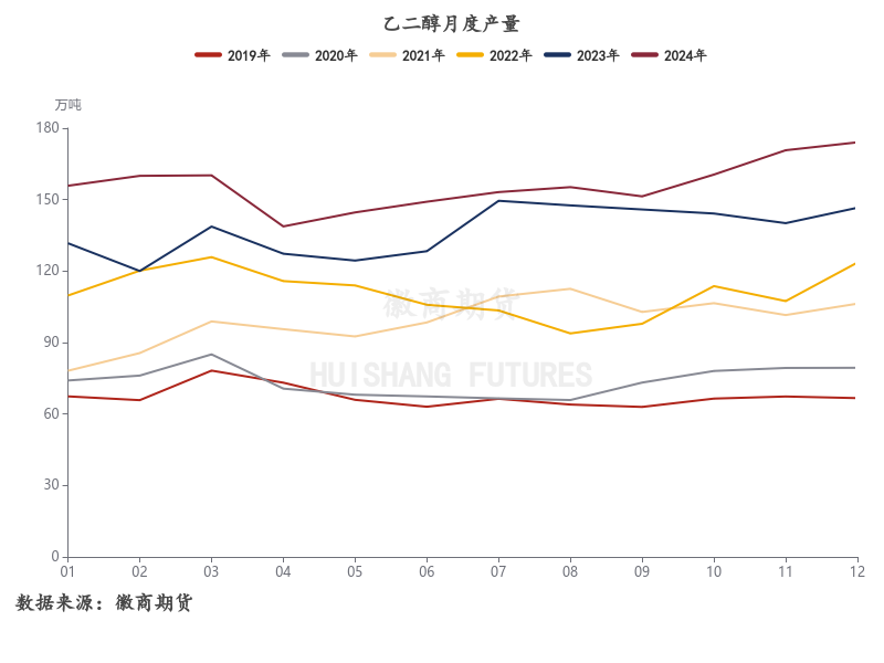 2024年我国乙二醇新增产能35万吨,产能仅增长1.25%至2844万吨,低于预计投产。2025年乙二醇的产能增量较少,预计约180万吨装置投产,其中个别装置因效益原因从2024年继续推迟至2025年,多套装置投产确定性较低,相较聚酯而言投产计划偏少,2024年新增产能压力并不大。
