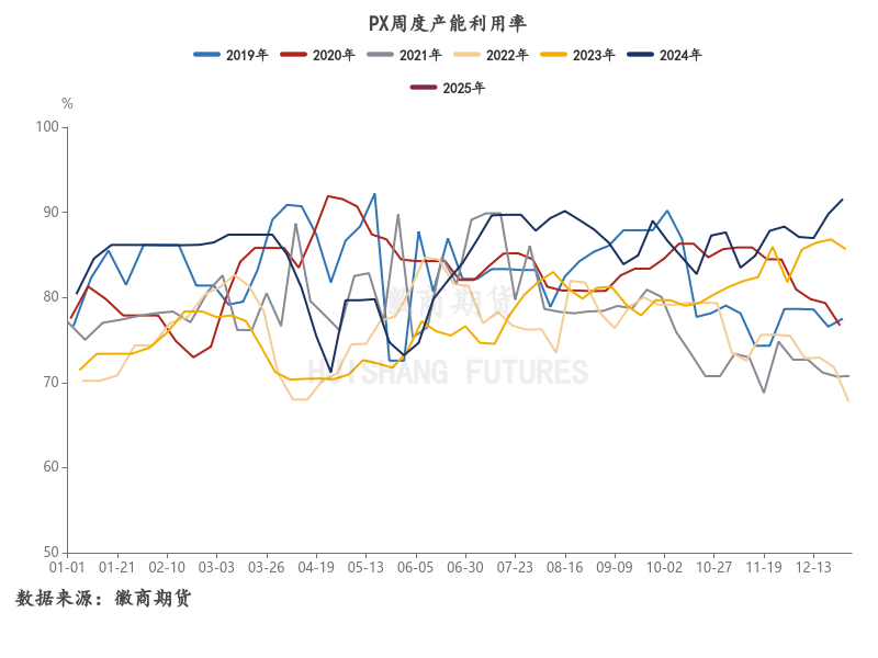 2024年我国PX无新增产能,总产能维持在4373万吨。虽然裕龙岛炼化一体化一期项目于2024年9月投产,但PX装置仍处于前期推进及调试阶段,PX新装置投产预计继续推迟,因此近两年PX虽一直有投产预期,但实际上处于投产真空期,已经进入产能扩张周期末端,2025年产能压力不大。