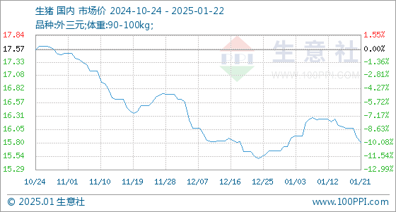 1月22日,生意社生猪基准价为15.80元/公斤,与本月初(15.72元/公斤)相比,上涨了0.51%。