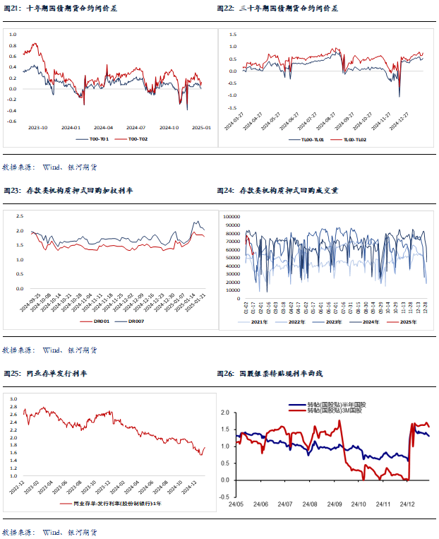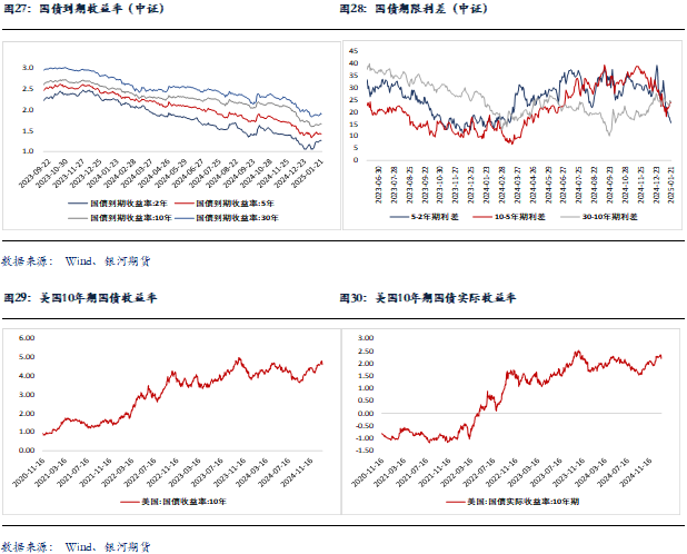 海外方面,特朗普上任当天表示暂不对外普征关税,受此影响,美元大幅走弱,人民币随之走强。不过,随后特朗普表示将考虑从2月起对加拿大和墨西哥开征25%进口关税,从而带动美元指数从低位再度反弹。我们倾向于认为,关税政策作为特朗普竞选时的核心诉求之一,后续逐步落地是大概率事件。但考虑到美国国内当前通胀读数仍相对偏高,高利率环境恶化其财政可持续性,关税政策推出的节奏可能偏慢,实际强度也存在一定不确定性。