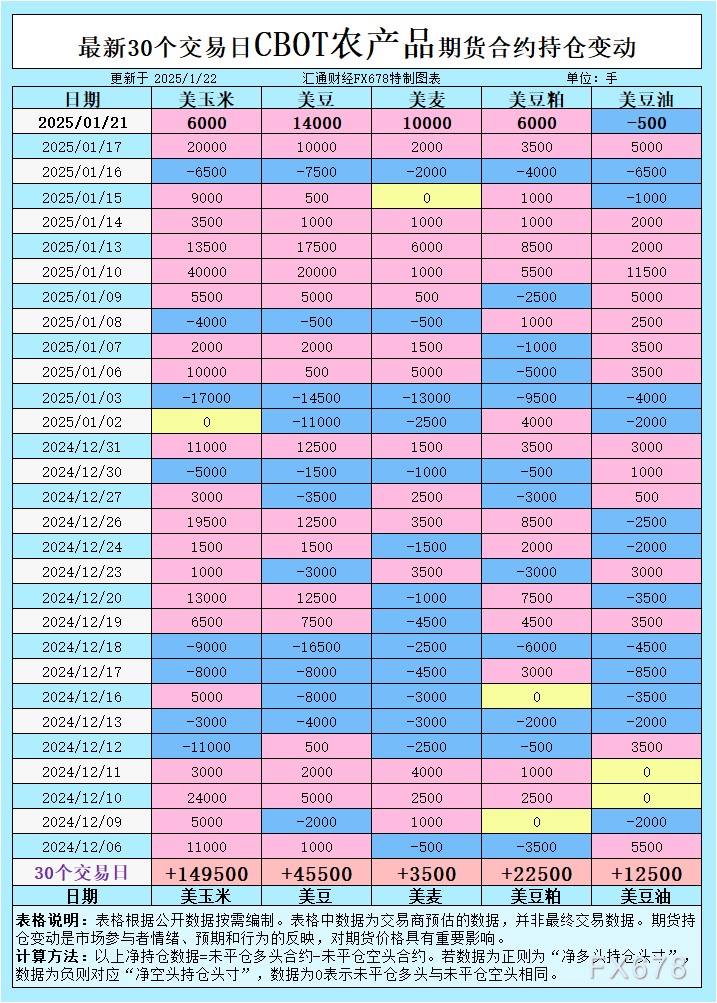 增加CBOT玉米投机性净多头;增加CBOT大豆投机性净多头;增加CBOT小麦投机性净多头;增加CBOT豆粕投机性净多头;增加CBOT豆油投机性净空头;
