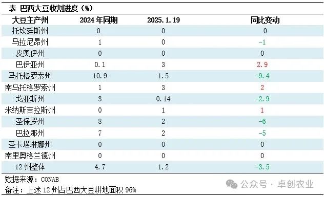 巴西大豆收割进度慢:巴西新豆收获进度仍处于历史低位,据巴西国家商品供应公司(CONAB)公布的数据显示,截至1月19日,大豆收获进度为1.2%,一周前为0.3%,去年同期为4.7%。据农业咨询公司AgRural数据显示,截至1月16日,巴西2024/25年度大豆收割工作完成1.7%,这是自2020/21年度以来的最低水平。巴西大豆收割进度缓慢,说明市场短期内供应压力不大,有利于国际大豆走高,也从成本端给国内豆油带来上涨支撑。