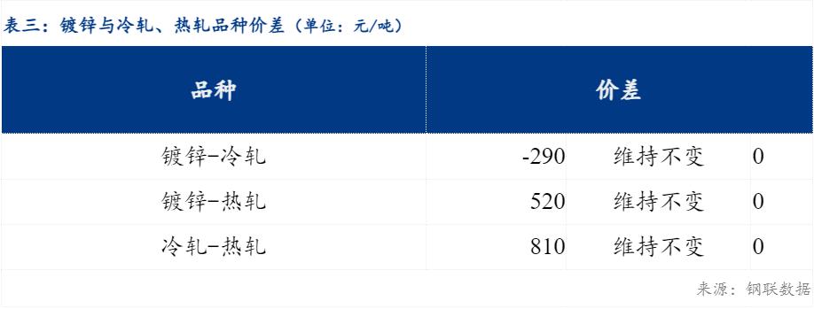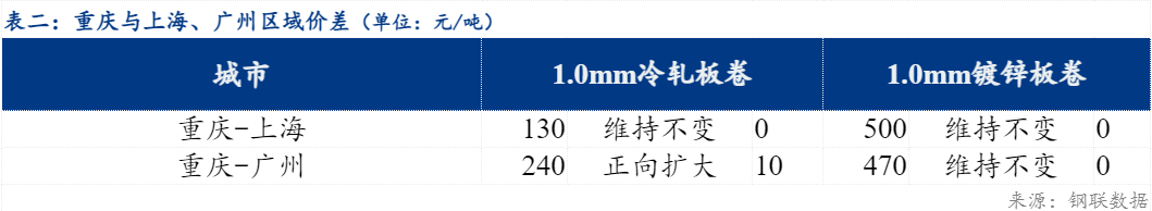 重庆、上海地区冷轧板卷区域价差维持不变,重庆、广州冷轧板卷区域价差扩大10元/吨;重庆、上海镀锌板卷区域价差维持不变,重庆、广州镀锌板卷区域价差维持不变。镀锌、冷轧品种价差维持不变;镀锌、热轧品种价差维持不变;冷轧、热轧品种价差维持不变。