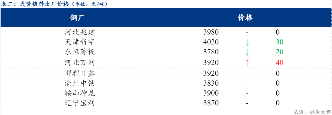 今日北方民营钢厂镀锌出厂指导价在3780元/吨-4020元/吨。