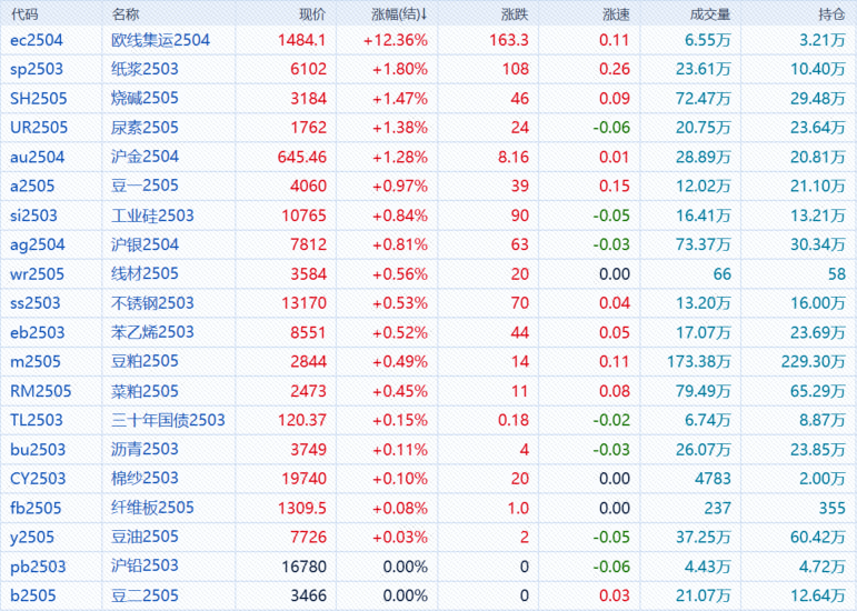 1月22日,午盘收盘,国内期货主力合约涨跌互现,集运指数(欧线)涨超12%,纸浆、尿素、烧碱、沪金涨超1%,豆一、工业硅、沪银涨近1%。跌幅方面,低硫燃料油(LU)跌超2%,液化石油气(LPG)、硅铁、玻璃跌近2%。