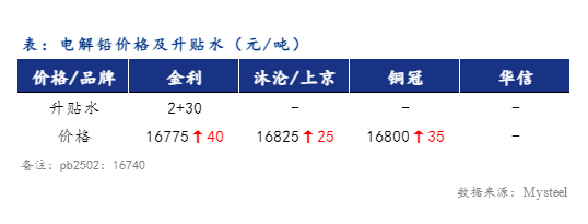 期铅震荡运行,上海市场持货商对沪铅2502合约升水150元/吨,升水上调;河南市场贸易商对沪铅2502合约报平水至升水30元/吨出厂,升水持平;广东市场持货商未有报价。