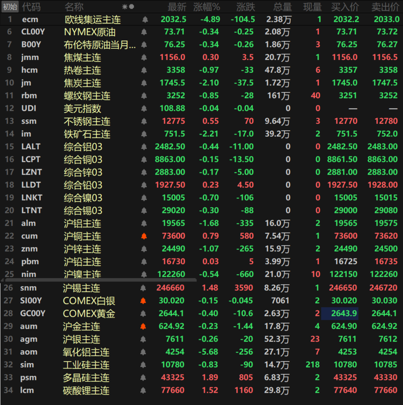 此外,碳酸锂主连涨1.52%,多晶硅主连涨1.89%。工业硅主连跌0.83%。欧线集运主连跌4.89%。