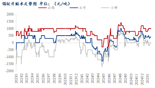 今日套盘商对沪锡2502合约套盘云锡升水1000元/吨左右,普通云字升水400-600元/吨;小牌平水附近,进口锡贴水800元/吨左右。