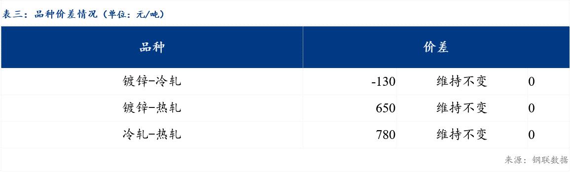 品种价差来看,现镀冷价差为-130元/吨,较上一交易日维持不变;镀热价差为650元/吨,较上一交易日维持不变;冷热价差为780元/吨,较上一交易日维持不变。