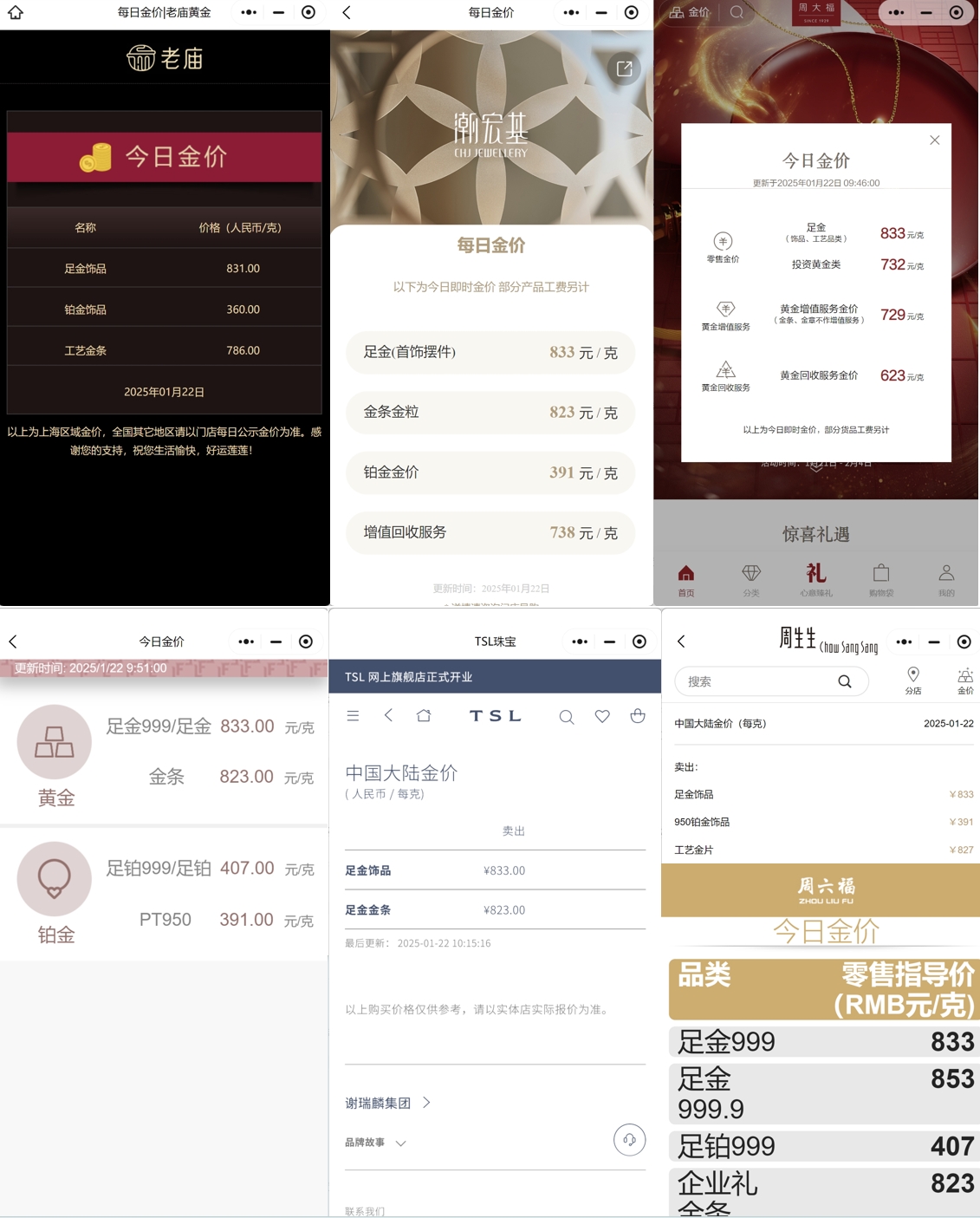 具体而言,周大福足金(首饰、摆件类)、六福珠宝足金999/足金、潮宏基足金(首饰摆件)、周生生足金饰品、谢瑞麟足金饰品当日公开的境内价格为833元/克,老庙黄金上海区域足金饰品价格达831元/克。