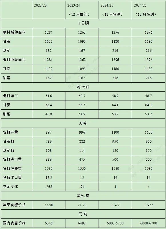 1.2023/24榨季国内蔗糖产量大增、甜菜糖略增,整体产量同比增加,进口量同比恢复至平均水平;24/25榨季产量预期继续恢复,进口量保持乐观。