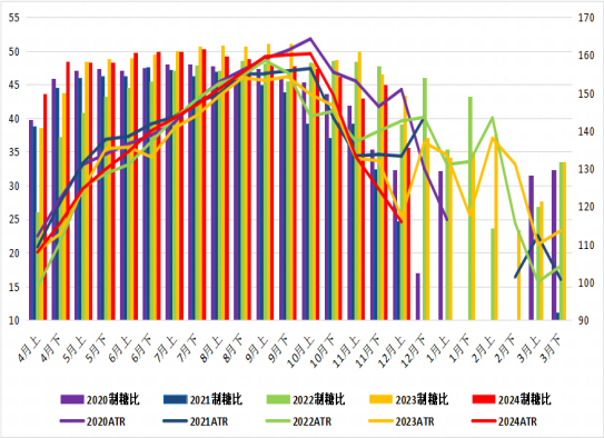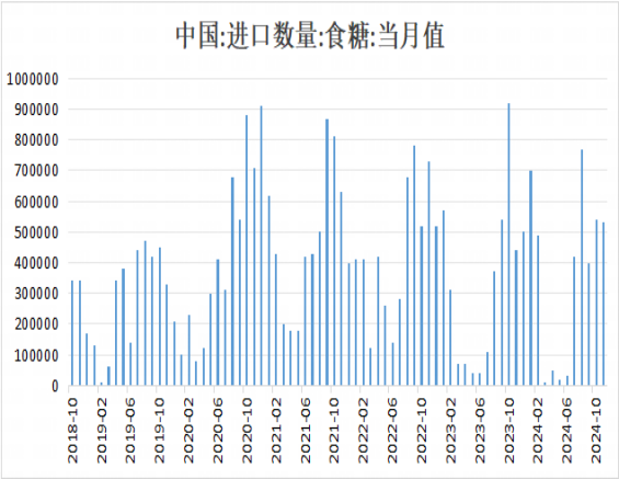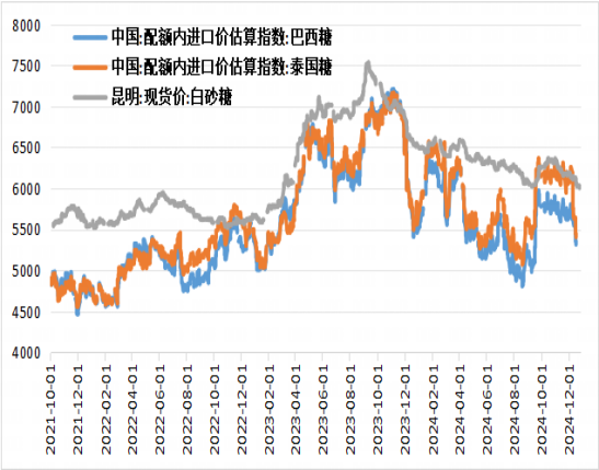 8月份ICE糖跌至低位时,配额外进口利润为正,出现持续一个月的进口窗口期,9月份ICE糖快速上涨过程中,国内配额外进口商若未及时点价,年底前后配额外进口量预期偏少。2024年12月30日,ICE原糖收盘价为19.12美分/磅,人民币汇率为7.2994。经测算,配额内巴西糖加工完税估算成本为5058元/吨,配额外巴西糖加工完税估算成本为6491元/吨;与日照白糖现货价比,配额内巴西糖加工完税估算利润为1222元/吨,配额外巴西糖加工完税估算利润为-211元/吨。