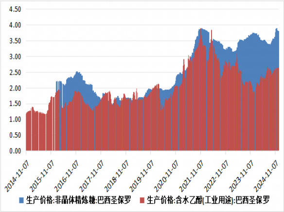 根据印度糖和生物能源制造商协会(ISMA)的数据,截至2024年12月15日,印度2024/25榨季糖产量达到613.9万吨,较去年同期的740.5万吨减少126.6万吨,降幅17.1%;已开榨糖厂数量为477家,较去年同期的496家减少19家。今年卡纳塔克邦的糖厂开榨时间较去年晚7~12天;马哈拉施特拉邦的糖厂开榨时间较去年晚15~20天。ISMA预计2024/25榨季转向乙醇生产的食糖数量增至约400万吨,较去年的215万吨增加185万吨,增幅86.05%。截至2024年11月1日,印度E20燃料乙醇和汽油掺混比例最高达16.1%,共有17402个汽油零售点正在销售E20混合汽油。印度政府设定的目标是到2025年乙醇和汽油掺混比例达到20%,并有信心实现这一目标。