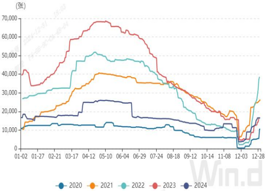 郑糖市场:23/24榨季国内产量与进口量同比均增加,供应压力较大,但中下游消费持续良好,8-10月国内去库存较快,现货价止跌回稳,期货市场先抑后扬。年底前内强外弱,郑塘市场在5500一线止跌回升,持续反弹至年底前的6150一线。截止2024年12月31日,郑州期货交易所白糖注册仓单10,517张,仓单加有效预报合计16,529张,环比无变化,从季节性来看,仓单加有效预报合计位于历史平均水平。郑州白糖期货价格5,961元/吨。