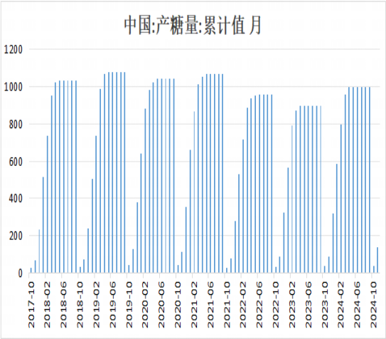 2024年9月12日呼伦贝尔晟通糖业科技有限公司率先开机生产,标志着2024/25年制糖期全国食糖生产正式开始。截至10月20日,内蒙古11家、新疆14家甜菜糖厂已全部开机生产;截至12月底,甘蔗糖厂已大部分开榨。截至11月底,全国共95家糖厂开机生产。其中,甜菜糖厂28家,甘蔗糖厂67家。全国共生产食糖136.79万吨,同比增加48.16万吨,增幅54.34%;累计销售食糖60.9万吨,同比增加29.22万吨,增幅92.23%;累计销糖率44.52%,同比加快8.78个百分点。2024/25年制糖期全国制糖工业企业成品白糖累计平均销售价格5989元/吨,同比下跌776元/吨。2024年11月成品白糖平均销售价格5998元/吨,同比下跌802元/吨,环比回升54元/吨。