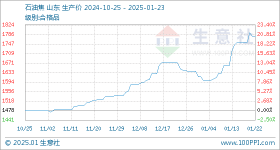 1月23日,生意社石油焦基准价为1780.00元/吨,与本月初(1615.00元/吨)相比,上涨了10.22%。