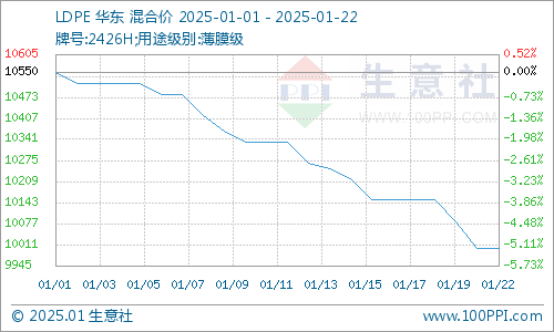 据生意社商品行情分析系统监测,LDPE(2426H)1月1日国内价格在10550元/吨,1月22日均价在10000元/吨,期间报价下跌5.21%。