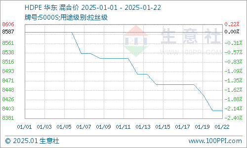 据生意社商品行情分析系统监测,HDPE(2426H)1月1日国内价格在8587元/吨,1月22日均价在8400元/吨,期间报价下跌2.18%。
