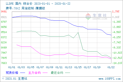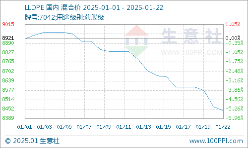 据生意社商品行情分析系统监测,LLDPE(7042)1月1日国内价格在8921元/吨,1月22日均价在8441元/吨,期间报价下跌5.38%。