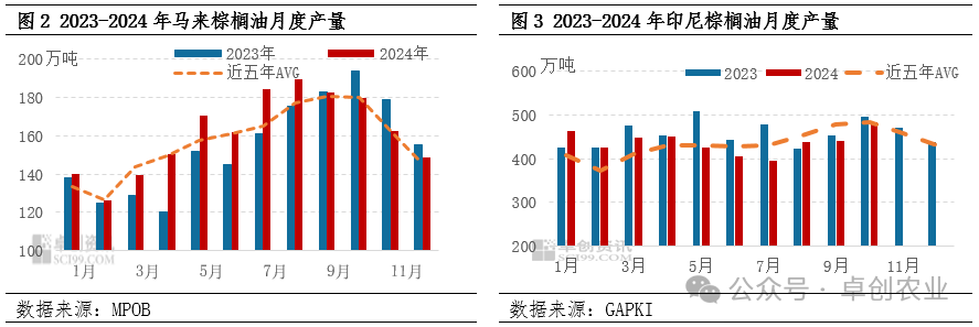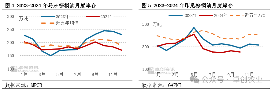2024年马棕出口增幅大于供应增幅,库存同比维持较低水平。12月为年内低点170.81万吨,3月份马来棕榈油转入增产周期,库存逐步回升但累库节奏偏慢,9月库存达到年内高点201.4万吨,但仍低于近五年均值,低库存给予棕榈油市场支撑。