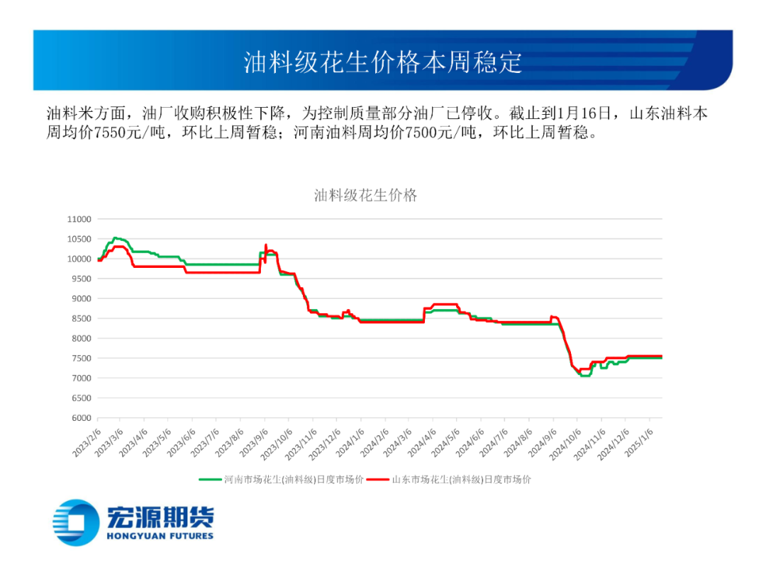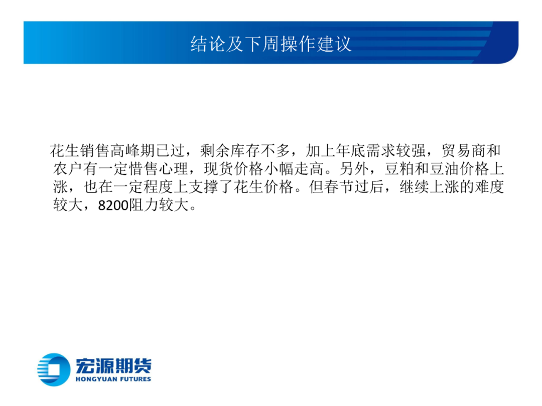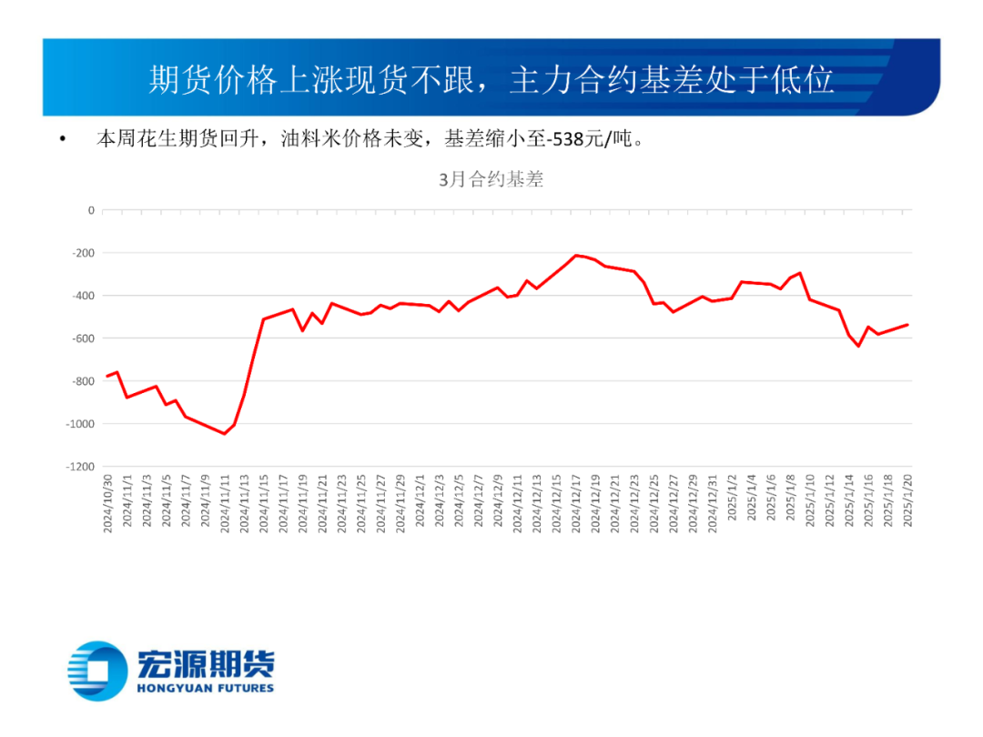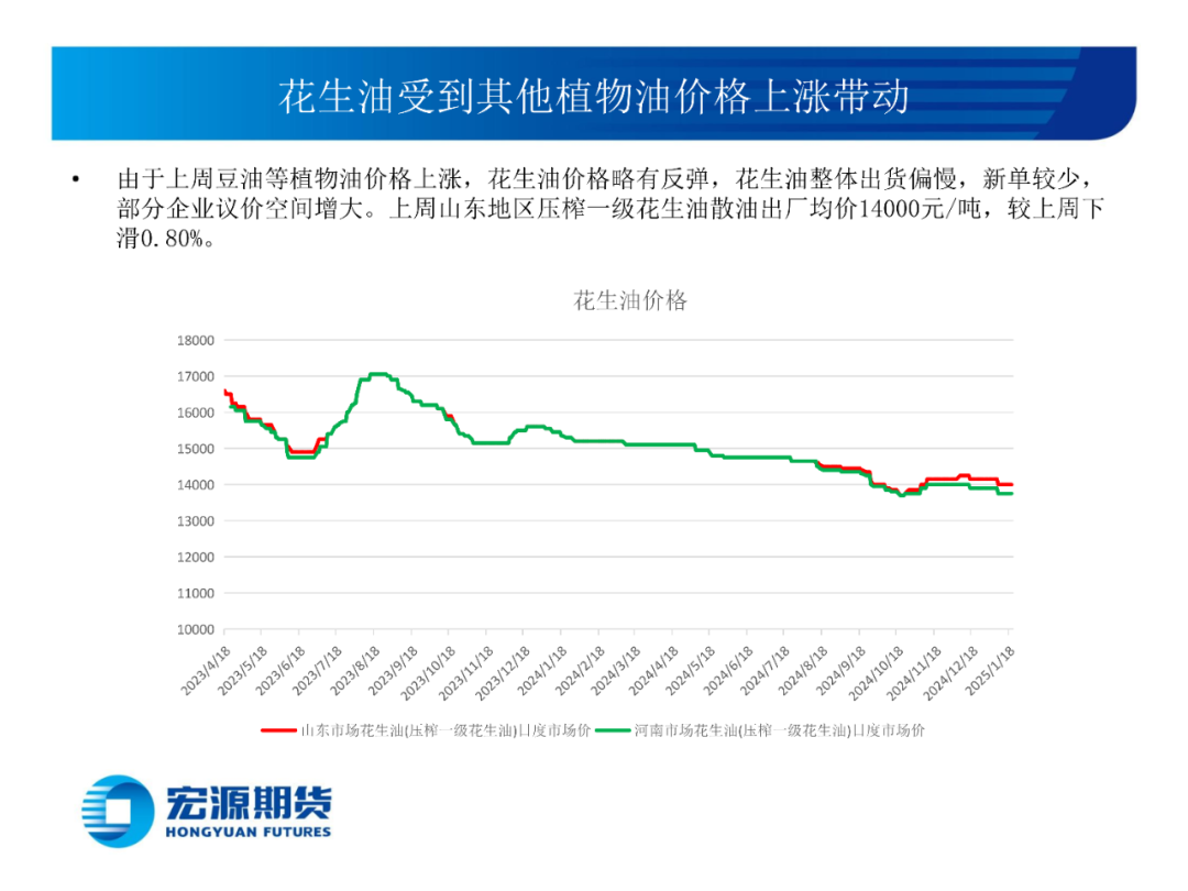 花生销售高峰期已过,剩余库存不多,加上年底需求较强,贸易商和农户有一定惜售心理,现货价格小幅走高。另外,豆粕和豆油价格上涨,也在一定程度上支撑了花生价格。但春节过后,继续上涨的难度较大,8200阻力较大。