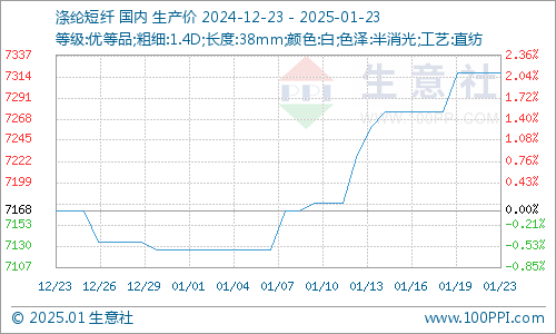 近期,国内主流涤纶短纤工厂价格持稳,截止1月23日江浙地区1.4D*38mm出厂均价在7318元/吨。主要是由于成本下跌对涤纶短纤支撑减弱,贸易商价格微跌,临近春节下游纺企基本放假,成交冷清。