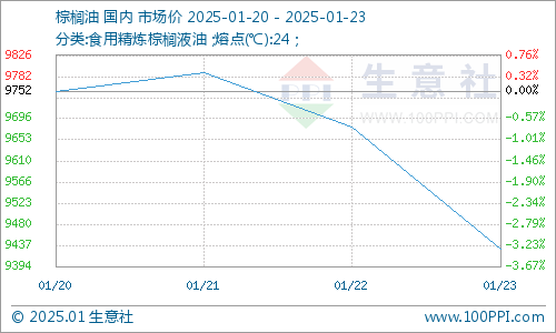 据生意社商品行情分析系统显示:春节前夕,棕榈油行情振荡下跌。1月20日,棕榈油市场均价9752元/吨,1月23日,棕榈油市场均价9430元/吨,价格下跌3.3%。