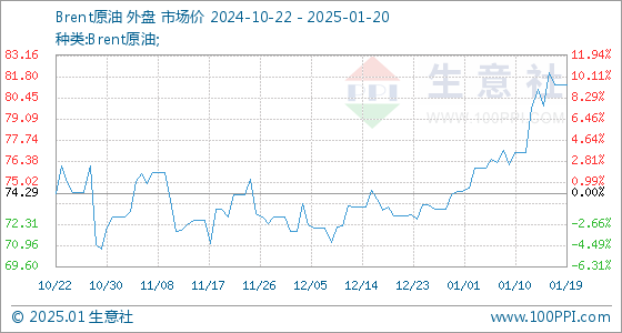 1月20日,生意社Brent原油基准价为81.29美元/桶,与本月初(74.39美元/桶)相比,上涨了9.28%。