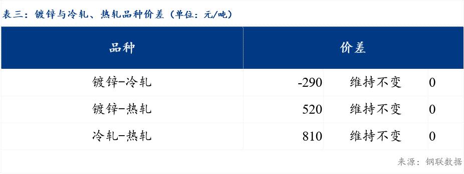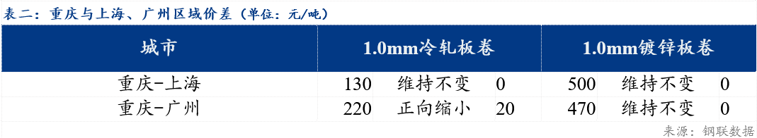 重庆、上海地区冷轧板卷区域价差维持不变,重庆、广州冷轧板卷区域价差缩小20元/吨;重庆、上海镀锌板卷区域价差维持不变,重庆、广州镀锌板卷区域价差维持不变。镀锌、冷轧品种价差维持不变;镀锌、热轧品种价差维持不变;冷轧、热轧品种价差维持不变。