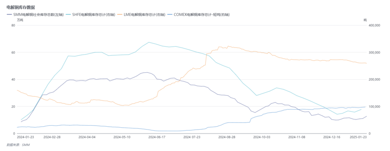 库存方面:从SMM全国主流地区铜库存数据来看:进入2025年,截至1月23日周四,SMM全国主流地区铜库存较周一上升1.74万吨至12.72万吨,较上周四上升1.91万吨。总库存较去年同期的8.52万吨高4.2万吨。目前国内铜库存周度数据虽然出现了累库,但最新的12.72万吨的库存数据依然维持在历史的相对低位,使得其对国内铜价有库存方面的支撑。回顾2024年的库存数据可以看到,春节后国内库存大幅累库,而5月份铜价突破新高使得下游消费受抑制,国内铜库存更是在去年6月初累库至45.07万吨,随着铜价回吐涨幅后,下游消费逐渐恢复,国内铜库存开始呈现去库,并于12月中下旬降至10万吨附近,后续随着铜价的波动以及消费端的需求变化有所反复。