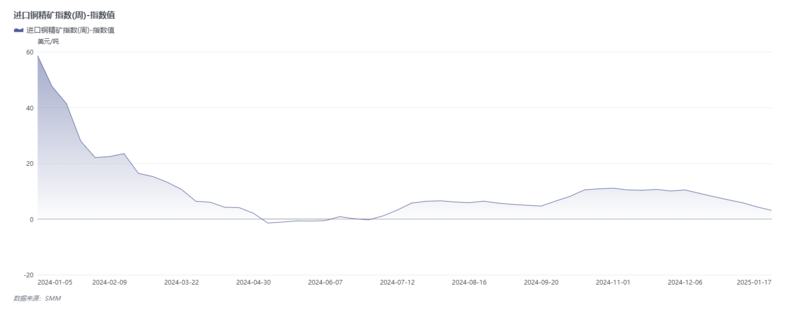 回顾2024年进口铜精矿指数(周)的表现不难看出,受市场对铜精矿供应短缺的担忧,铜精矿TC甚至在2024年年内出现负值。而未来全球铜精矿增量主要来自于已有的铜矿扩建项目,世界级铜矿新投产项目数量不仅有限,而且新投产项目难以带动铜精矿增量;世界范围内再难见大型的可供开发的铜矿项目。考虑到铜精矿供应担忧短期难以缓解,预计这将给铜价来自原料供应端的支撑。