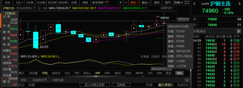 现货价格方面:据SMM报价显示,SMM1#电解铜2024年12月31日的均价为73790元/吨,2023年12月29日的均价为69230元/吨,其均价2024年上涨了4560元/吨,其年度涨幅为6.59%。进入2025年1月以来。SMM1#电解铜均价整体重心出现了小幅上移,随着年末临近,下游消费趋弱,铜价出现了偏弱震荡的走势,其1月23日的均价为74930元/吨,较前一交易日下跌520元/吨,跌幅为0.69%。