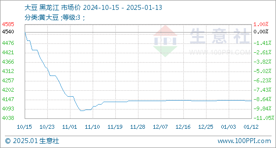 1月13日,生意社大豆基准价为4140.00元/吨,与本月初(4144.00元/吨)相比,下降了-0.10%。