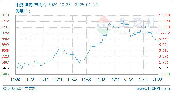 1月24日,生意社甲醇基准价为2630.00元/吨,与本月初(2758.33元/吨)相比,下降了-4.65%。