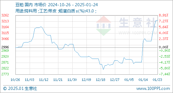 1月24日,生意社豆粕基准价为3222.00元/吨,与本月初(2866.00元/吨)相比,上涨了12.42%。