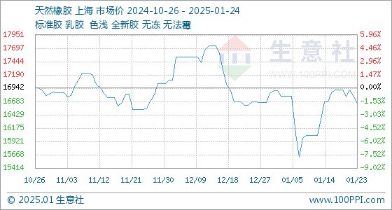 1月24日生意社天然橡胶基准价为16640.00元/吨