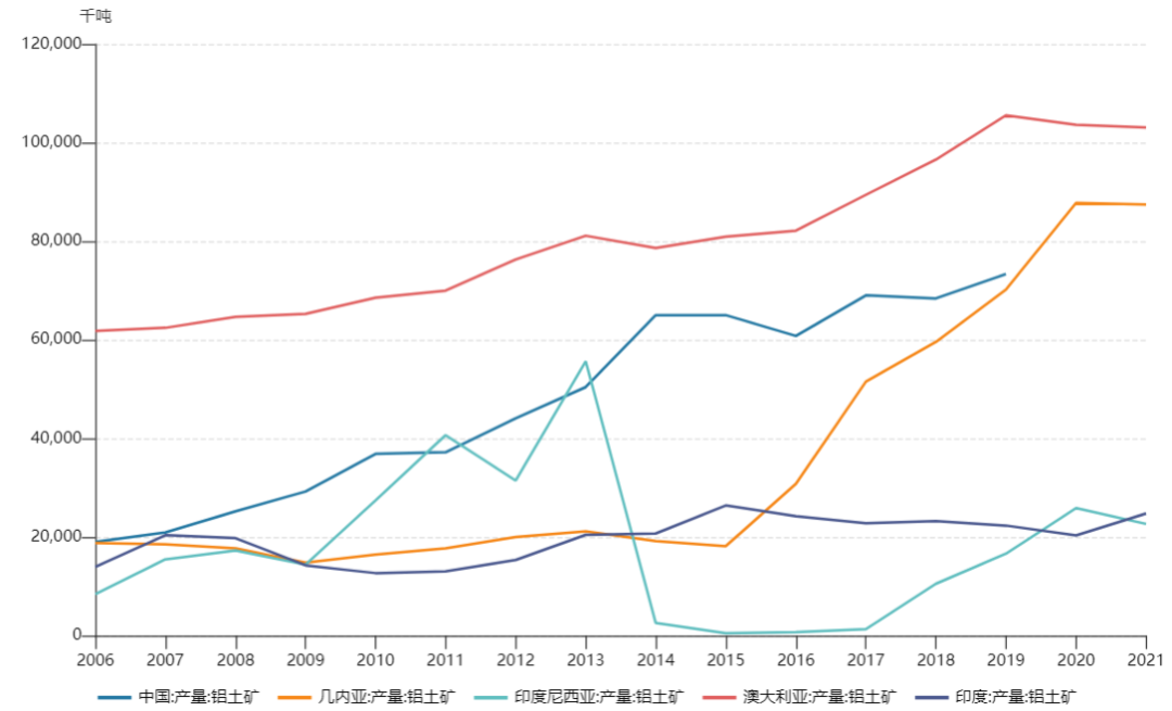 从铝土矿产量历史数据看,近年除了几内亚以外,其他核心铝土矿产区国家的产量并没有出现显著的增长,甚至中国、巴西、澳大利亚产区出现下滑趋势。