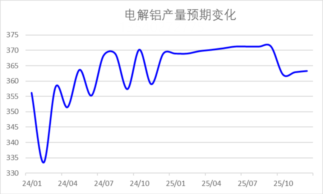 预计今年中国电解铝产量4422万吨,相较于2024年4311万吨,增量111万吨,增长2.57%。