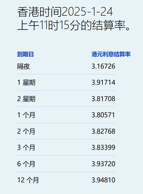 临近春节假期流动性趋紧,港元两个月及以下拆息全线反弹,其中,隔夜息升37基点至3.167262%,创近一周新高。与楼按相关的一个月拆息结束三连跌,报3.80571%。反映银行资金成本的三个月拆息降至3.83399%,六个月及一年期分别降至3.9372%和3.9481%。