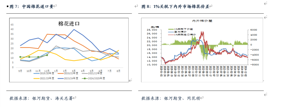 根据海关最新公布12月我国棉花进口量为13万吨,较去年同期减少13万吨,处于历年同期高位;2024/25年度(9-8月)累计进口46万吨,较上年度同期减少63万吨。