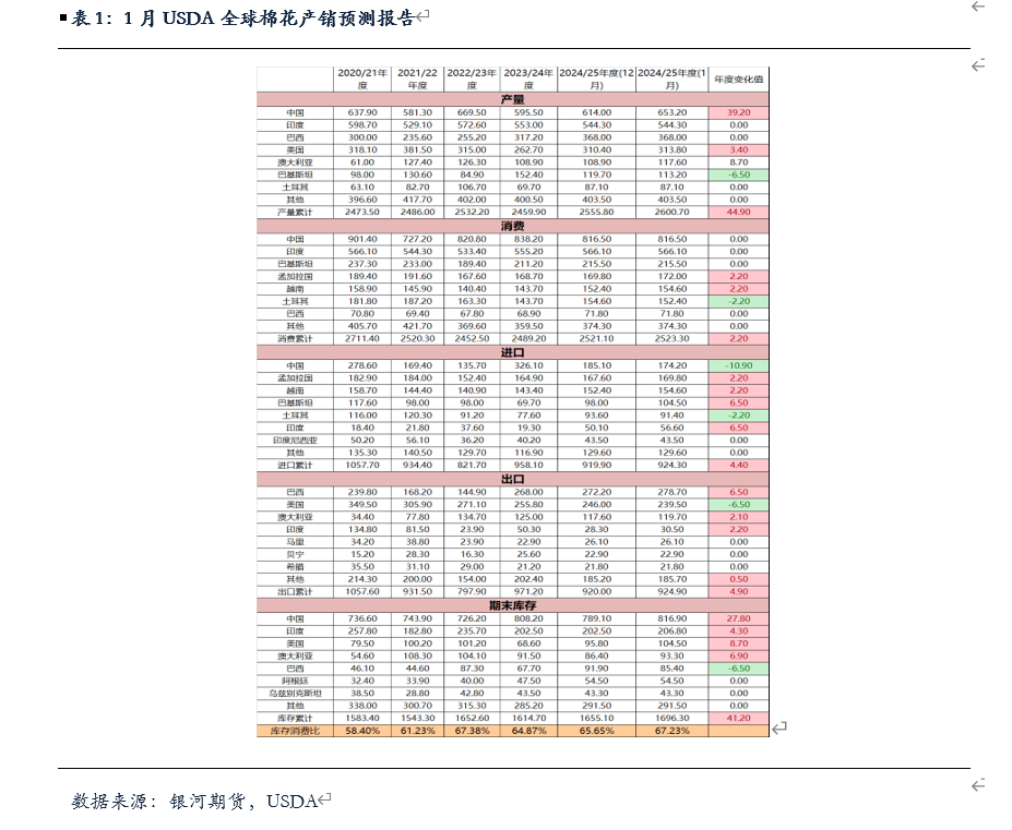 一、国际市场:1月USDA全球棉花产销预测,全球棉花产量略有调增、消费较上月变化不明显,全球供需结构矛盾不大。