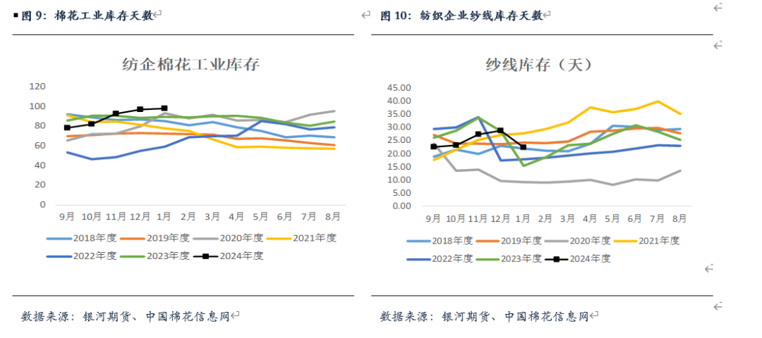 国内方面,供应端根据我国1月最新商业库存来看处于历年同期高位,其中新疆地区商业库存处于历年同期高位,预计本年度棉花供应前期维持宽松状态。按照当前加工情况来推算,今年新疆棉产量大概率将达到650万吨以上,甚至有更高的可能。目前市场供应端变数不多,市场交易逻辑逐渐向需求端转移,需求端近期订单情况变化略有改善,近期纱线库存有所下降,短期有好转的迹象,但幅度以及持续性尚待观察。如果春节后市场订单未出现明显增加可能会继续进入弱需求;如果节后订单表现进一步好转,将对棉花走势形成有效支撑。