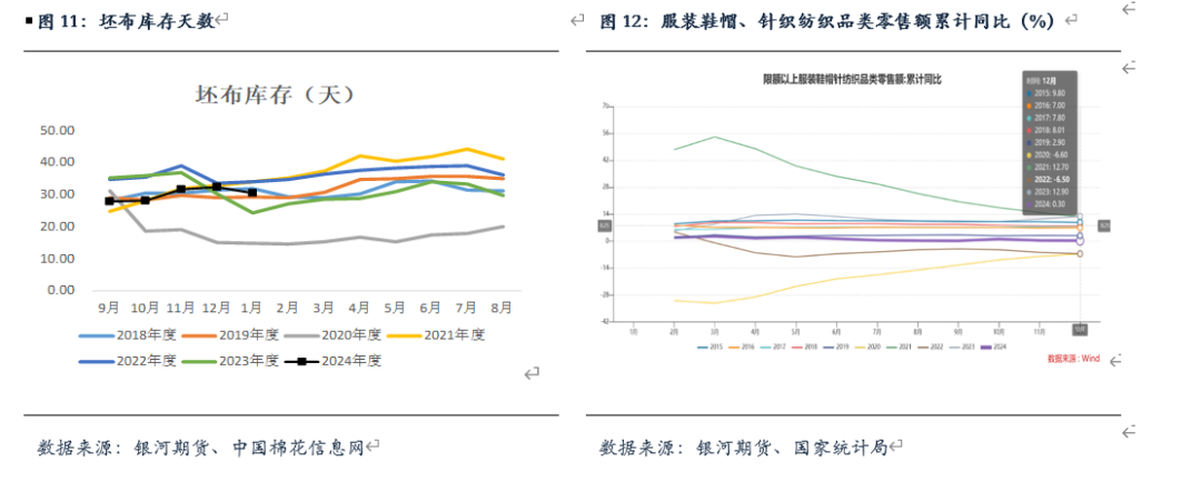 内需外需情况来看,12月内需、外需表现较上一月有所好转。12月份的服装、鞋帽、针纺织品类零售额为1629亿元,同比增加3.36%,1-12月累计零售额为14691亿元,同比增加0.3%,处于历年同期低位,仅仅高于2020年以及2022年疫情那两年。虽然2024年国内服装、鞋帽、针织纺织品类零售额销售一般,但是2025年如果国家出台相关政策刺激服装家纺等消费,考虑到服装是有季节性以及流行性影响的消费品,因此刺激效果可能会比较明显。