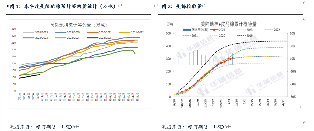 根据最新USDA供需报告来看,新年度美棉产量未作出明显调整,1月预估美棉产量在314万吨,处于历史中低位置。根据美国农业部的统计,截至2025年1月17日当周,美陆地棉+皮马棉累计检验量为304.8万吨,占年美棉产量预估值的97.1%(2024/25年度美棉产量预估值为314万吨)。美陆地棉检验量297.15万吨,检验进度达到了97.86%,同比快18%;皮马棉检验量8.01万吨,检验进度达到了78.7%,同比快33%。
