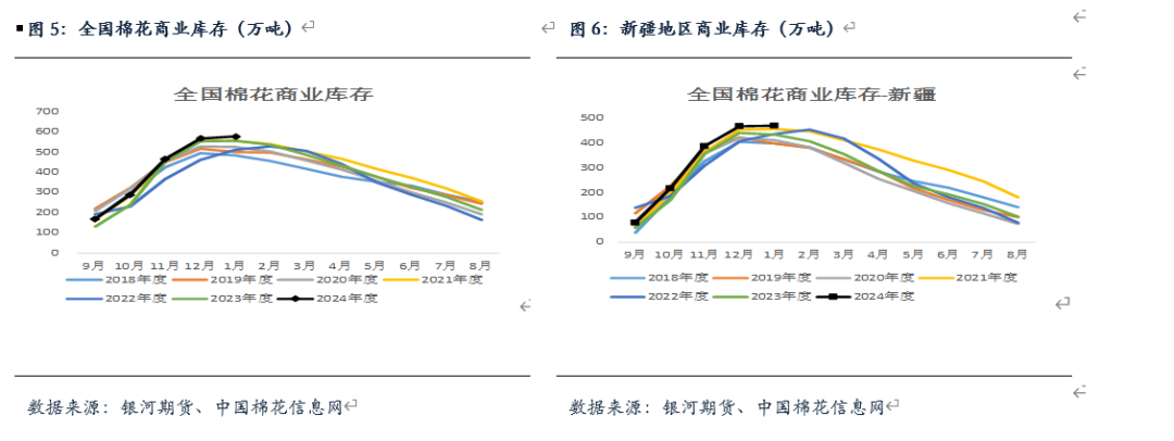 根据中国棉花信息网最新数据,1月15日我国棉花商业库存577.9万吨,环比增加9万吨;其中新疆库存472万吨,环比增加2万吨;而内地商业库存为63万吨,环比增加9万吨,虽然24/25年度内地商业库存处于历年同期较低的位置,但考虑到目前纯棉纺纱产能逐渐向新疆地区转移,因此预计内地虽然库存较低,但出现紧缺的可能性偏低。